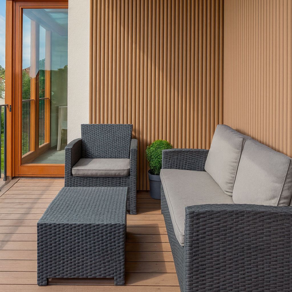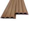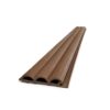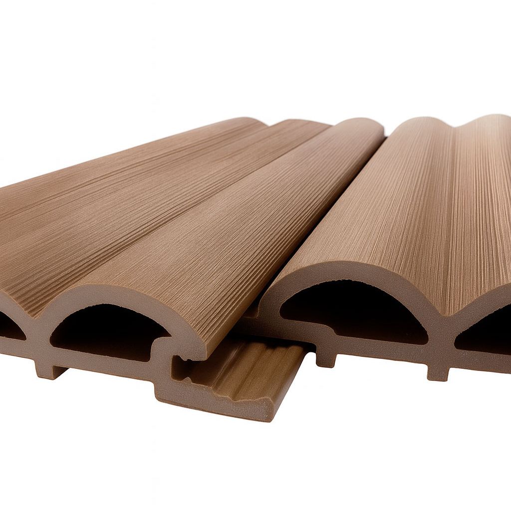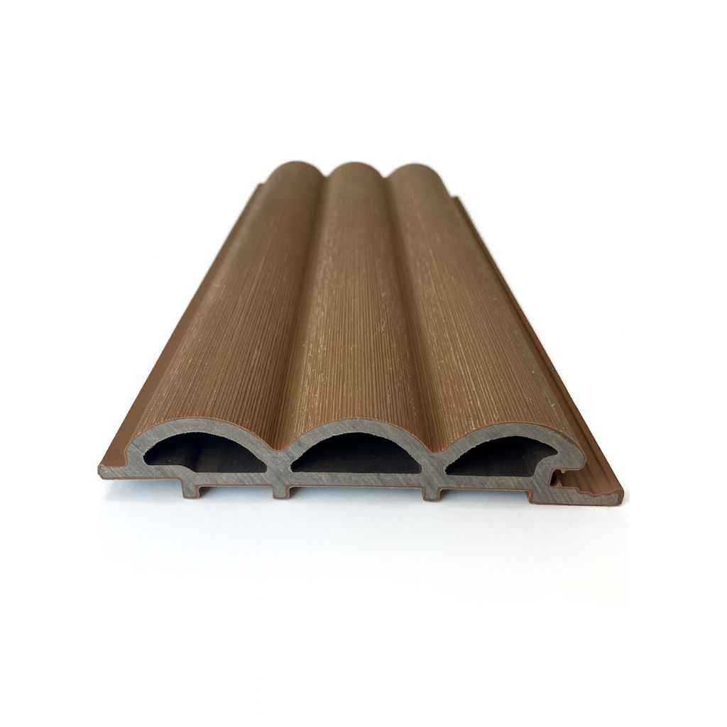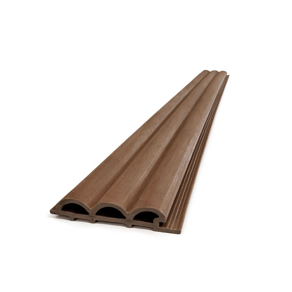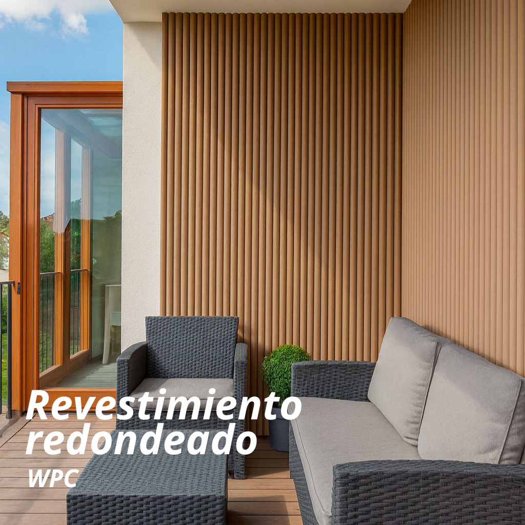 O painel ripado arredondado em WPC com dimensões 2200 x 140 x 28 mm (medida útil: 2200 x 120 x 27 mm) foi concebido para aplicação em fachadas exteriores e revestimento de paredes interiores. O seu formato com 3 ripas integradas por painel não só simplifica a instalação, como também melhora o desempenho estrutural, aumentando a durabilidade e a resistência à humidade e à radiação UV.